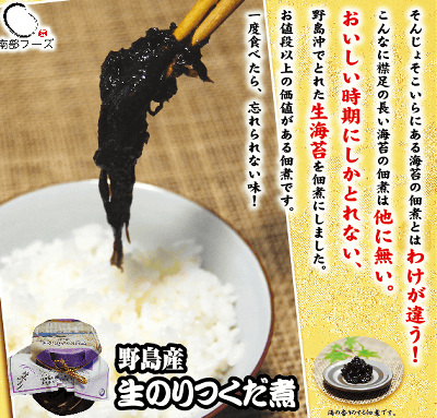 生のりつくだ煮 金沢区野島の海苔養殖場から原料となる生海苔を獲り、1本1本丁寧に洗い、海苔本来の風味や形を崩さないように仕上げた佃煮です。 140g 価格:810円(税込)